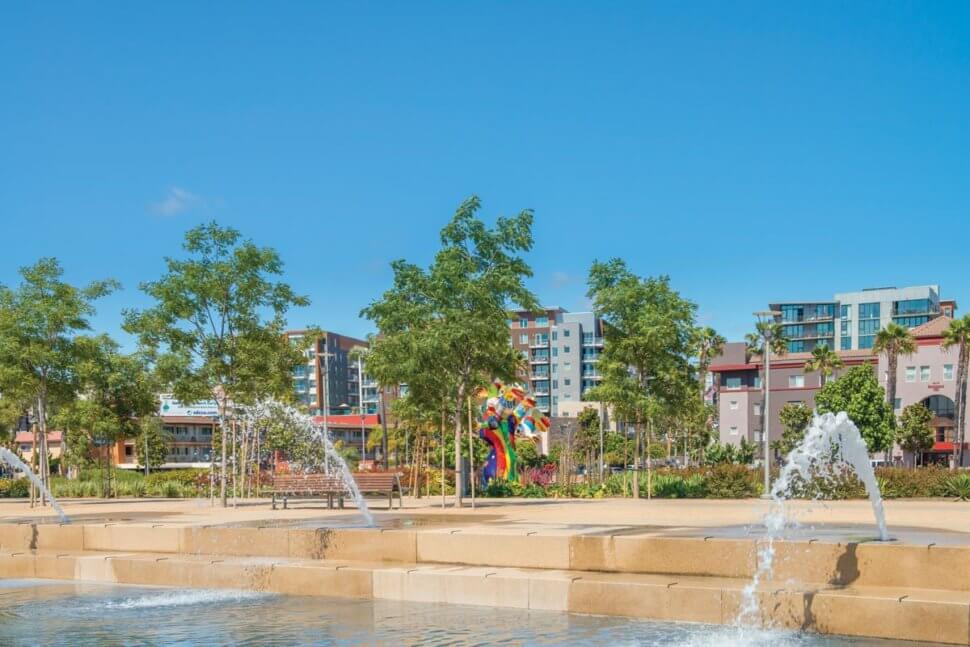 With its sunny skies and heavenly year-round climate, San Diego is a top vacation destination for tens of thousands of travelers each year. Waterfront Park, a fairly new attraction to the city, (opened in May of 2014) has become a favorite among locals and visitors. Located on Pacific Highway along the Embarcadero, the large urban space features an 830-foot-long fountain with wading pool — where you’ll see kids of all ages frolicking and splashing around in the cool water jets. There’s a large modern playground area with slides, climbing walls and an old-fashioned see-saw. An expansive green area, picnic tables, a concession stand and several pieces of public art round out the park, making it an ideal spot for a family picnic or just hanging out and enjoying the view of the harbor. When planning your San Diego vacation, you’ll definitely want to include a stop here — plan on spending a few hours if you’re bringing the kids! Here’s all you need to know before you go, plus what you can do and see that’s close by: